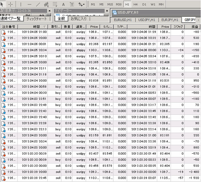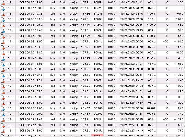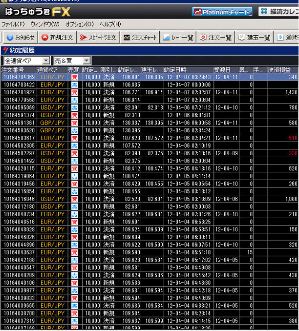 それでは、この累計損益比較に使用した国内低スプレッド業者(GMOクリック証券)とMT4業者(FXDD)との売買履歴を、すべて表示させます。