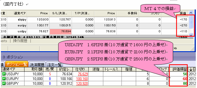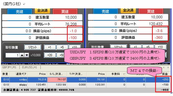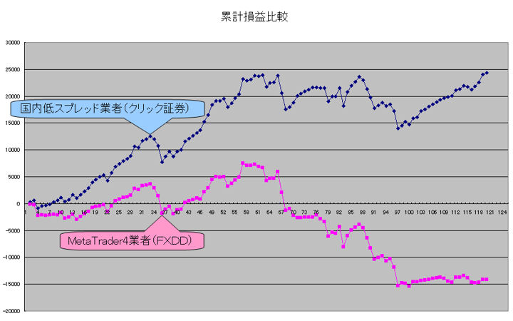 本システム発売直前約2ヶ月間における国内低スプレッド業者(GMOクリック証券)とMT4業者(FXDD)とで、その リアルの売買結果を比較したものです。