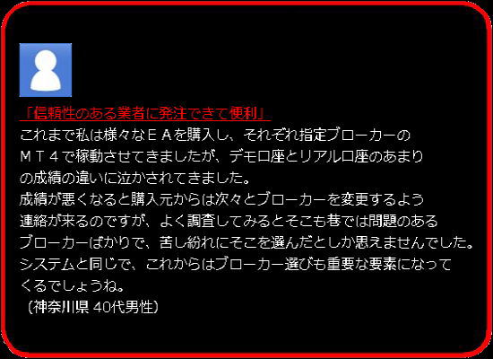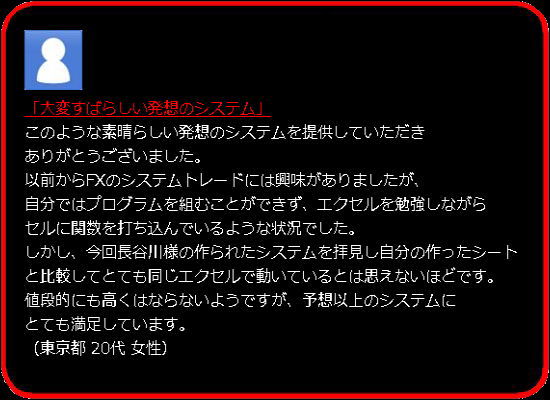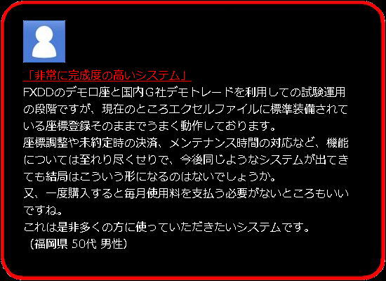 以前、私の商品をご購入いただいた方々(1500名以上)の中から希望される方に本システムを配布、2ヶ月以上ご利用いただいておりますが、現時点で、システム的には特に大きな問題は出ておらず、 ・トレードが楽しい。 ・エクセルを介して自動売買するというのは目から鱗。 ・偶然ではなく必然的にプラスになっているのがわかる。 ・FXD○、FXP○○、○XP、などの口座でトレードするのがばかばかしくなった。 というような、概ね好評な意見をいただいております。