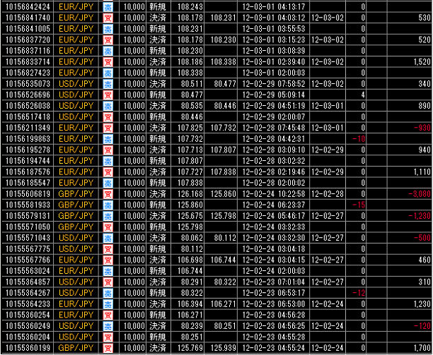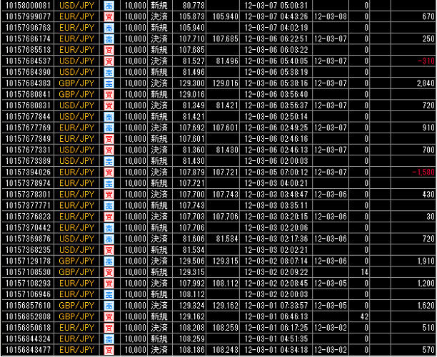 それでは、この累計損益比較に使用した国内低スプレッド業者(GMOクリック証券)とMT4業者(FXDD)との売買履歴を、すべて表示させます。
