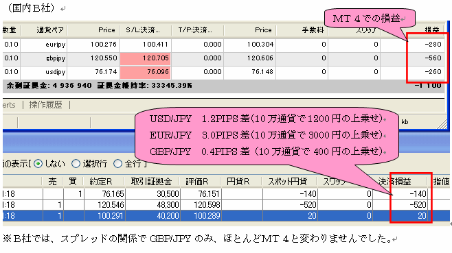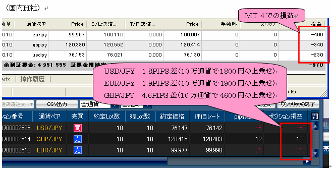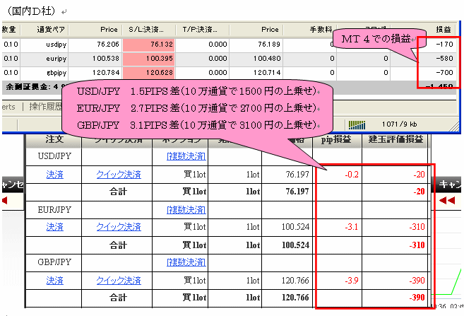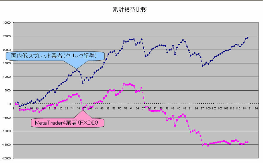 本システム(EA対応版)発売直前約2ヶ月間における国内低スプレッド業者(GMOクリック証券)とMT4業者(FXDD)とで、その リアルの売買結果を比較したものです。