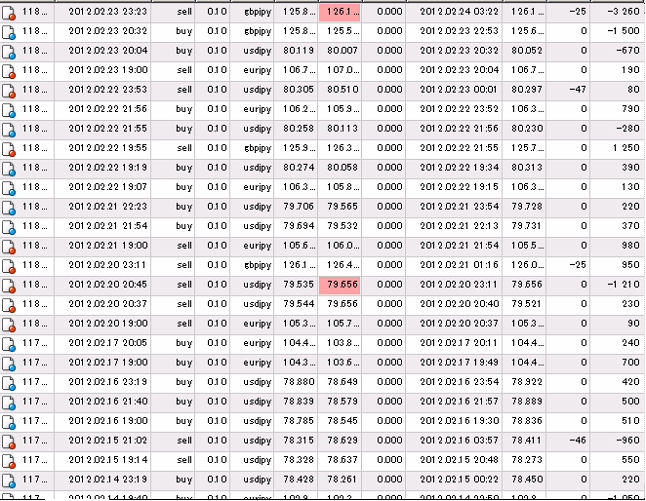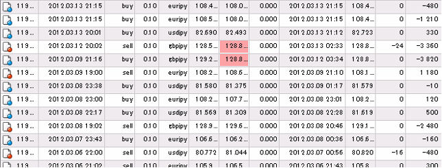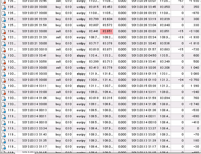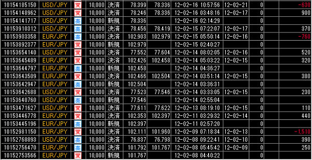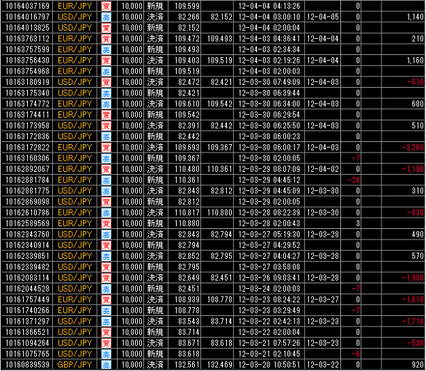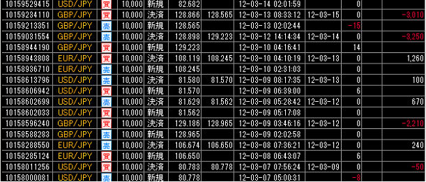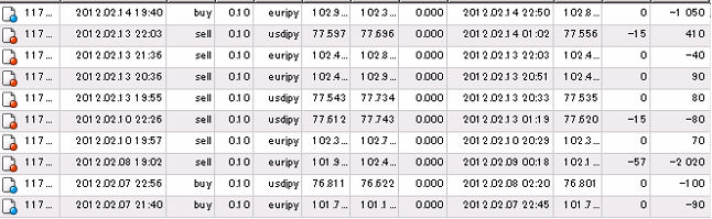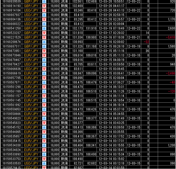 それでは、この累計損益比較に使用した国内低スプレッド業者(GMOクリック証券)とMT4業者(FXDD)との売買履歴を、すべて表示させます。