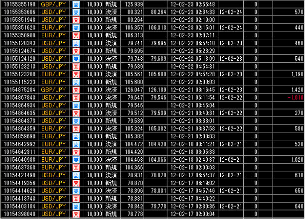 それでは、この累計損益比較に使用した国内低スプレッド業者(GMOクリック証券)とMT4業者(FXDD)との売買履歴を、すべて表示させます。